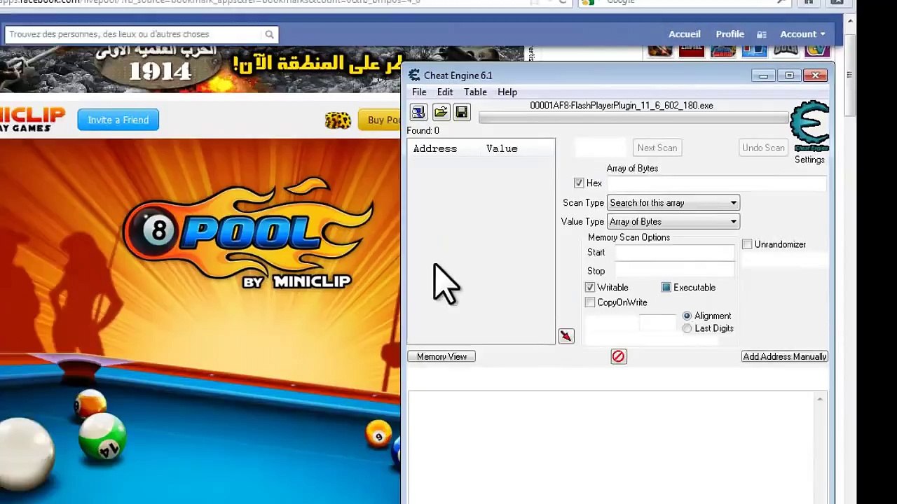 Hello guys new update for miniclip 8 ball pool open 8 ball pool open cheat engine select your browser (if you use mozilla firefox please select second flashplayer plugin) change array of byte scan a2 a0 a2 a0 62 select all results.